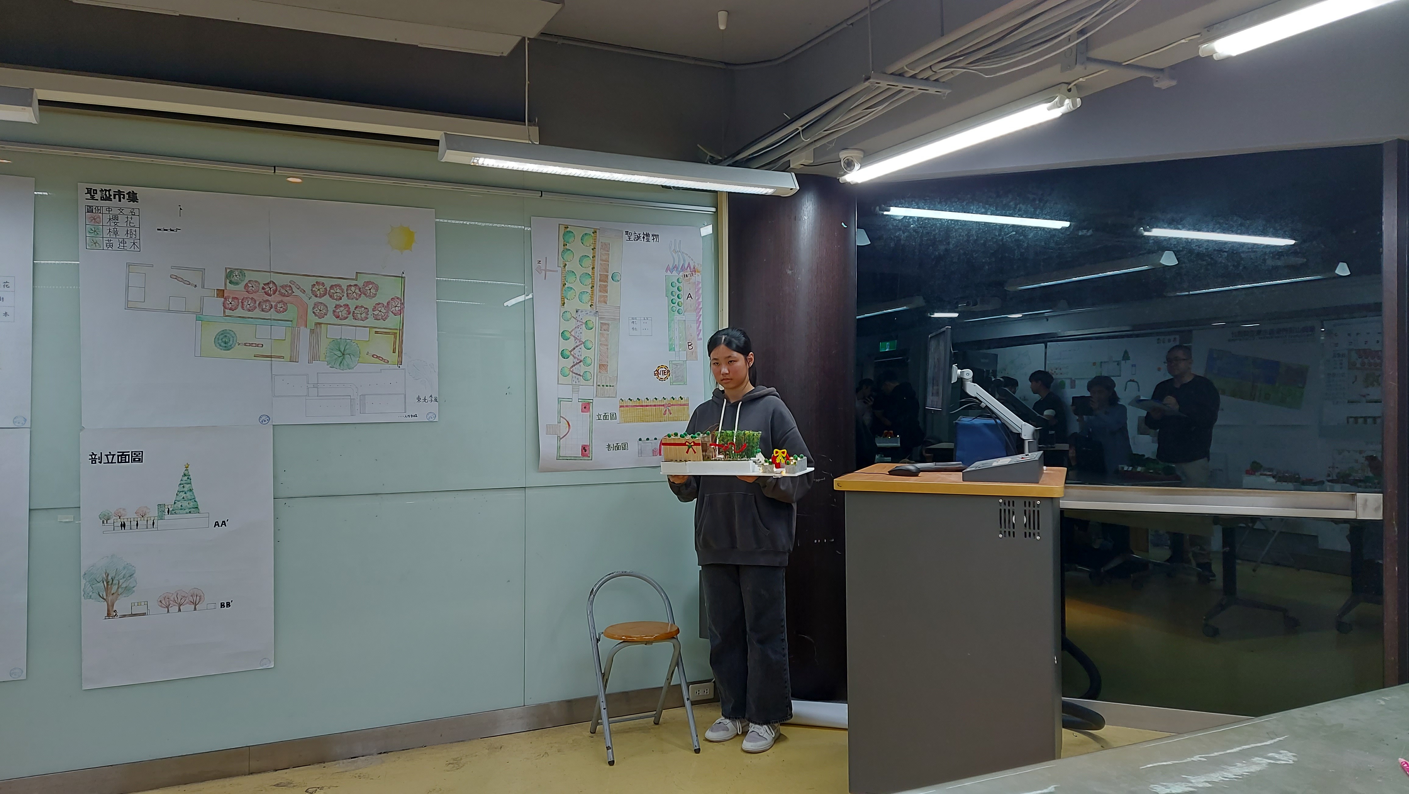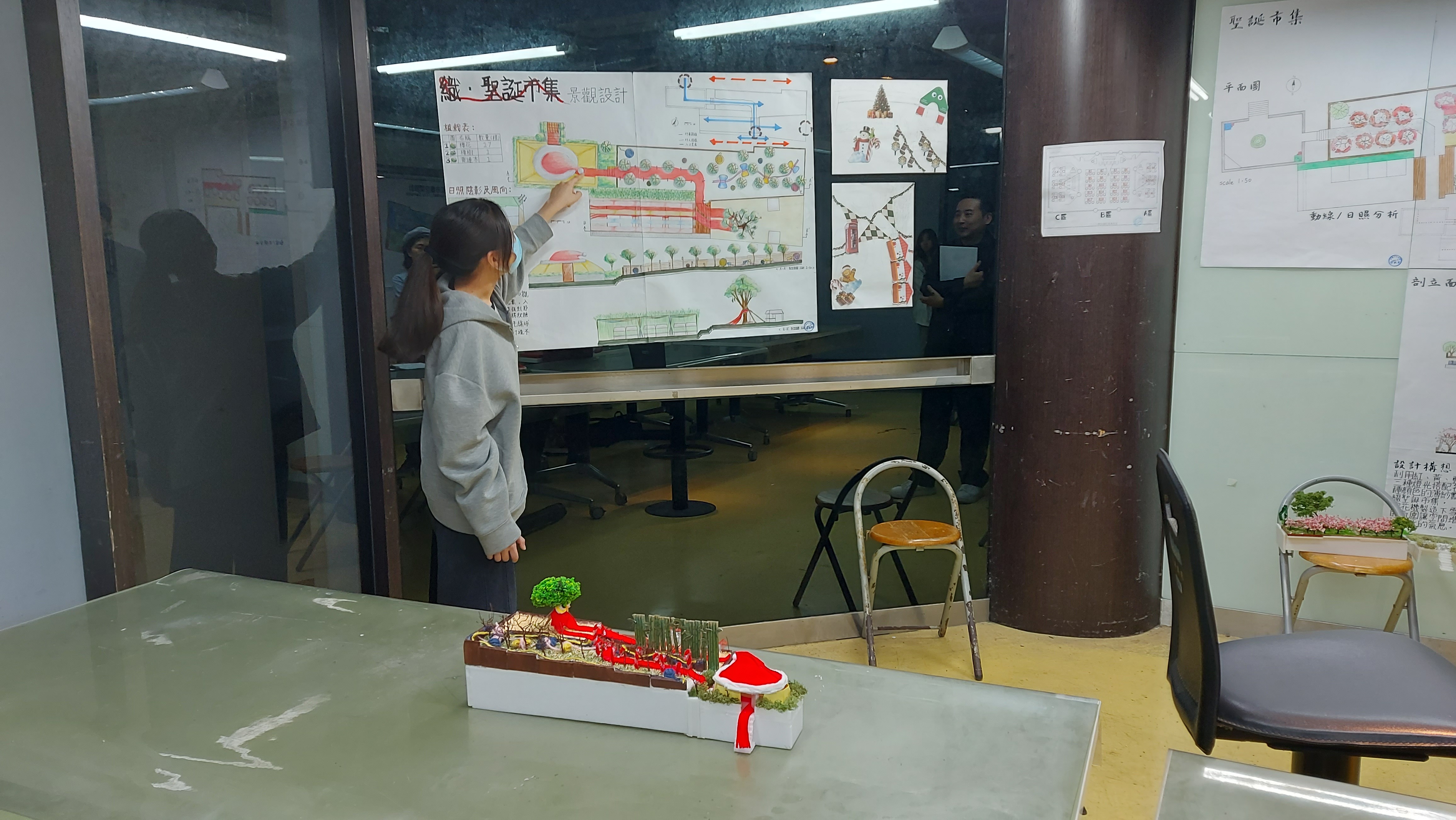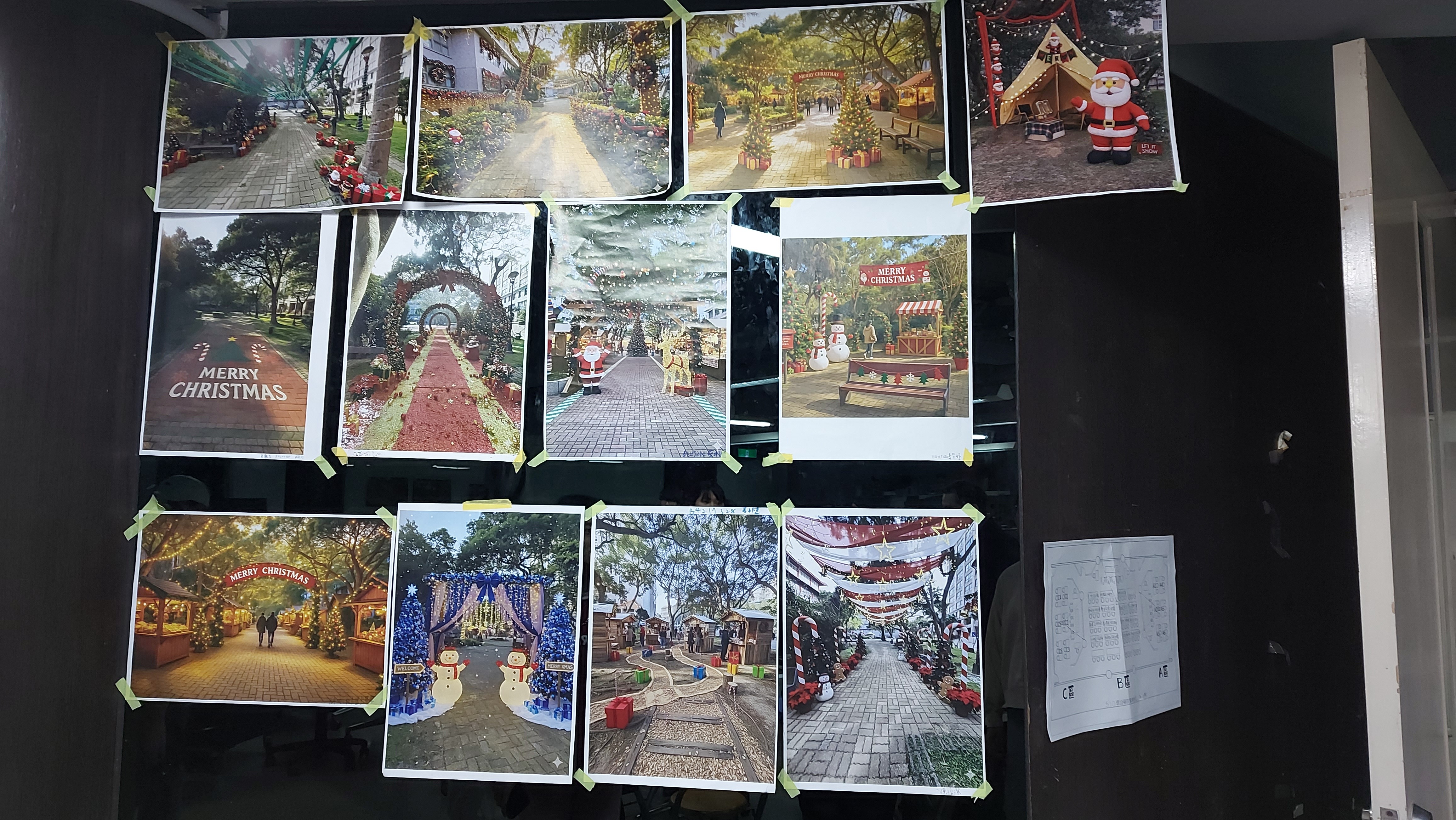 第一階段:聖誕色彩與元素的研究與聖誕市集空間的規劃,每位同學都需要研究並歸納能營造"聖誕"氛圍的元素與色彩,思考動線、如何使用空間和如何安排8間 2x2m 的市集小屋,創造出一個有聖誕氛圍、好用好玩的市集。