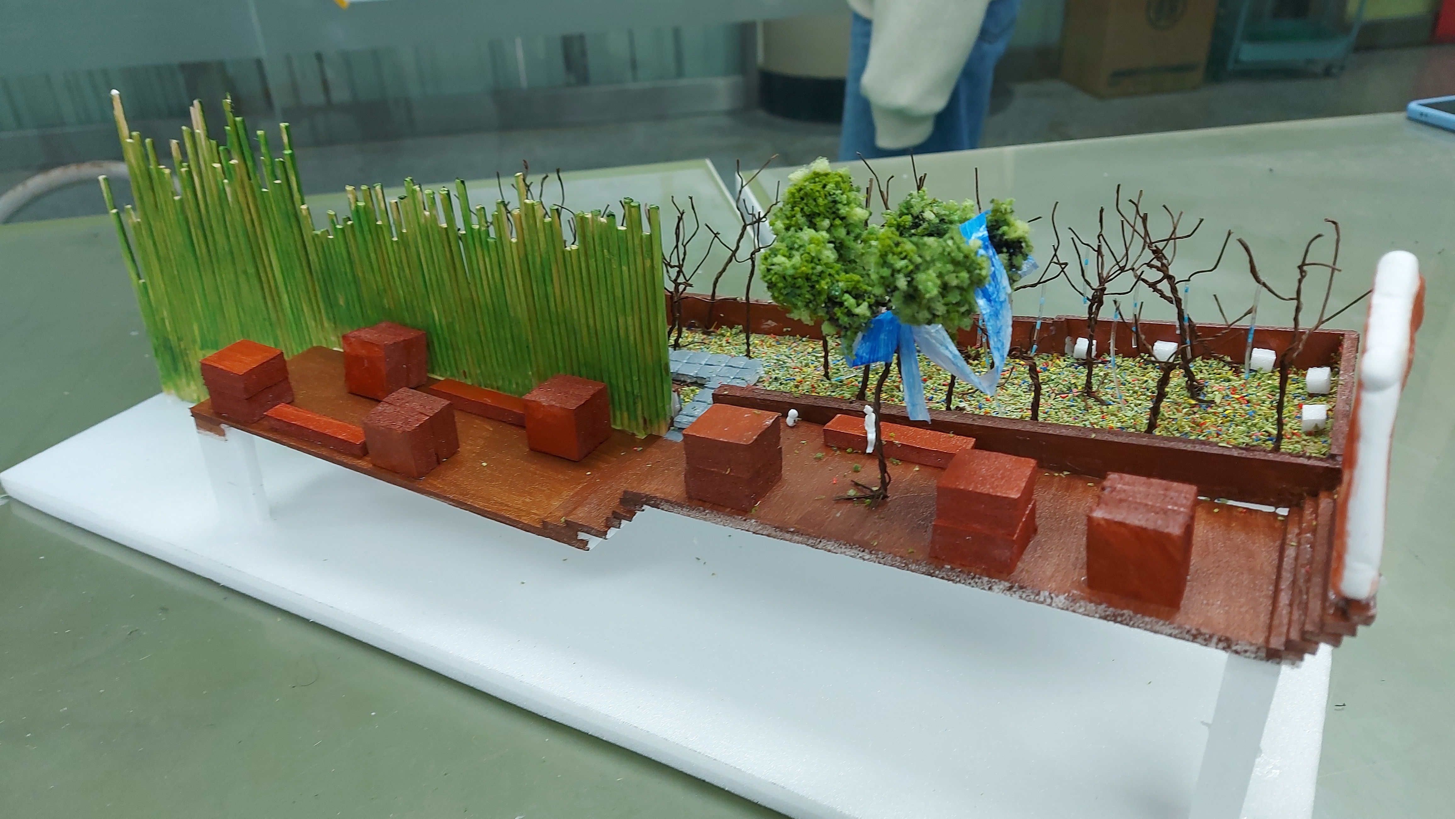 第三階段:實地測試與實作。我們經由嘗試錯誤」trial and error 和做中學」learning by doing,真實感受空間尺度和風環境的挑戰。東西拿出來太小? 再弄大一點。還是太小? 再弄大一點。是比例的問題? 還個地方試看看。東西拿出來會被風吹跑? 設法增加重量或固定。東西拿出來會被吹爛? 設法增強材料的強度。我們學會到現實環境中感知空間尺度,感知材料的脆弱,學習多方嘗試因應與調整。