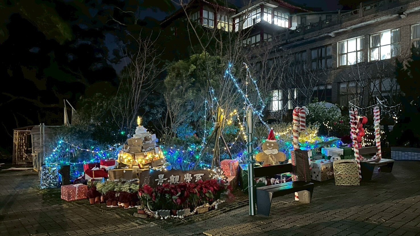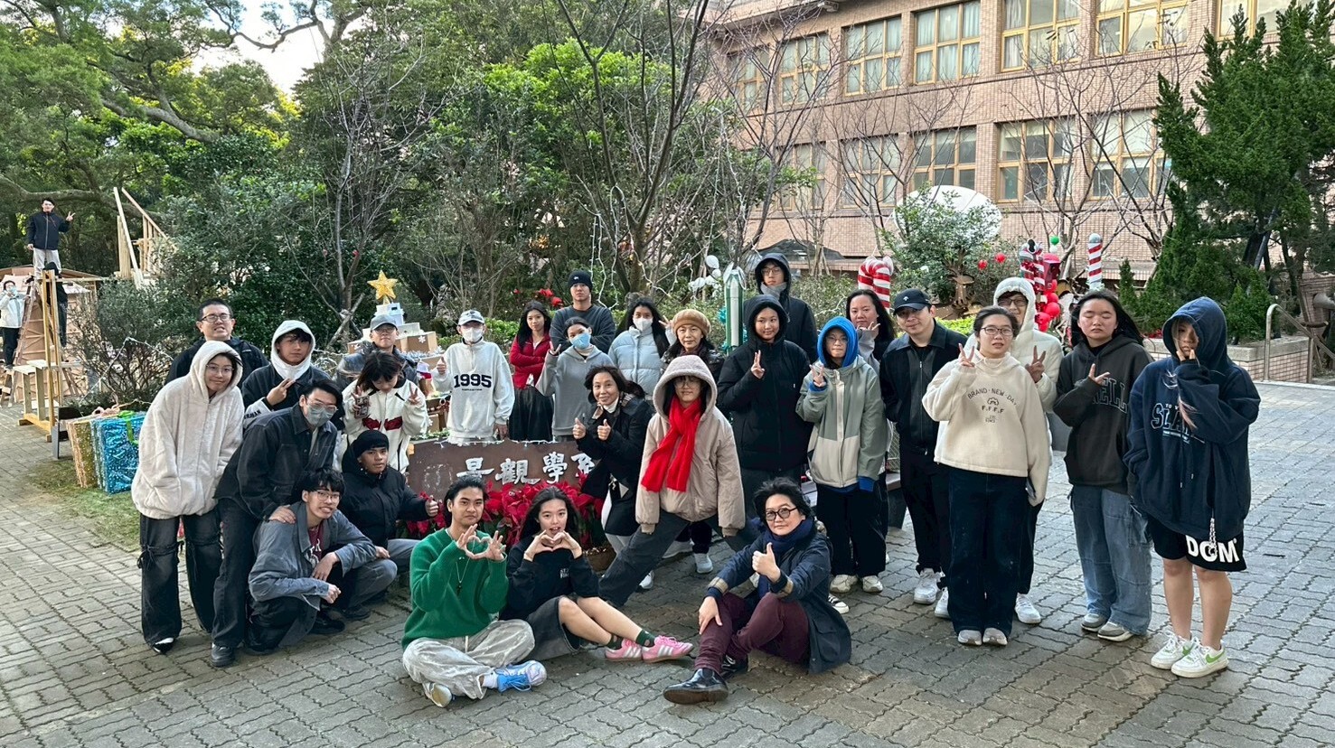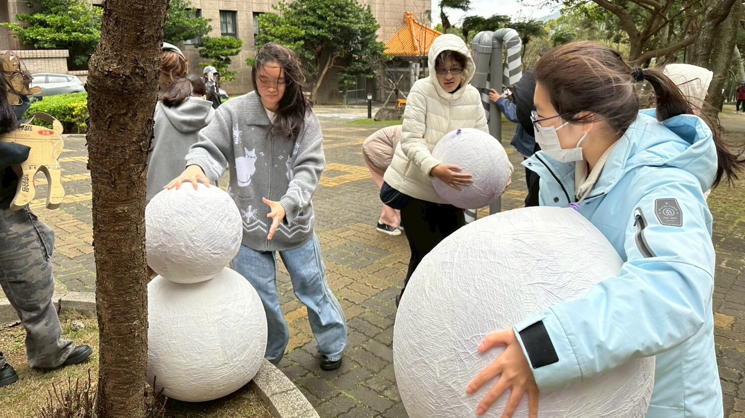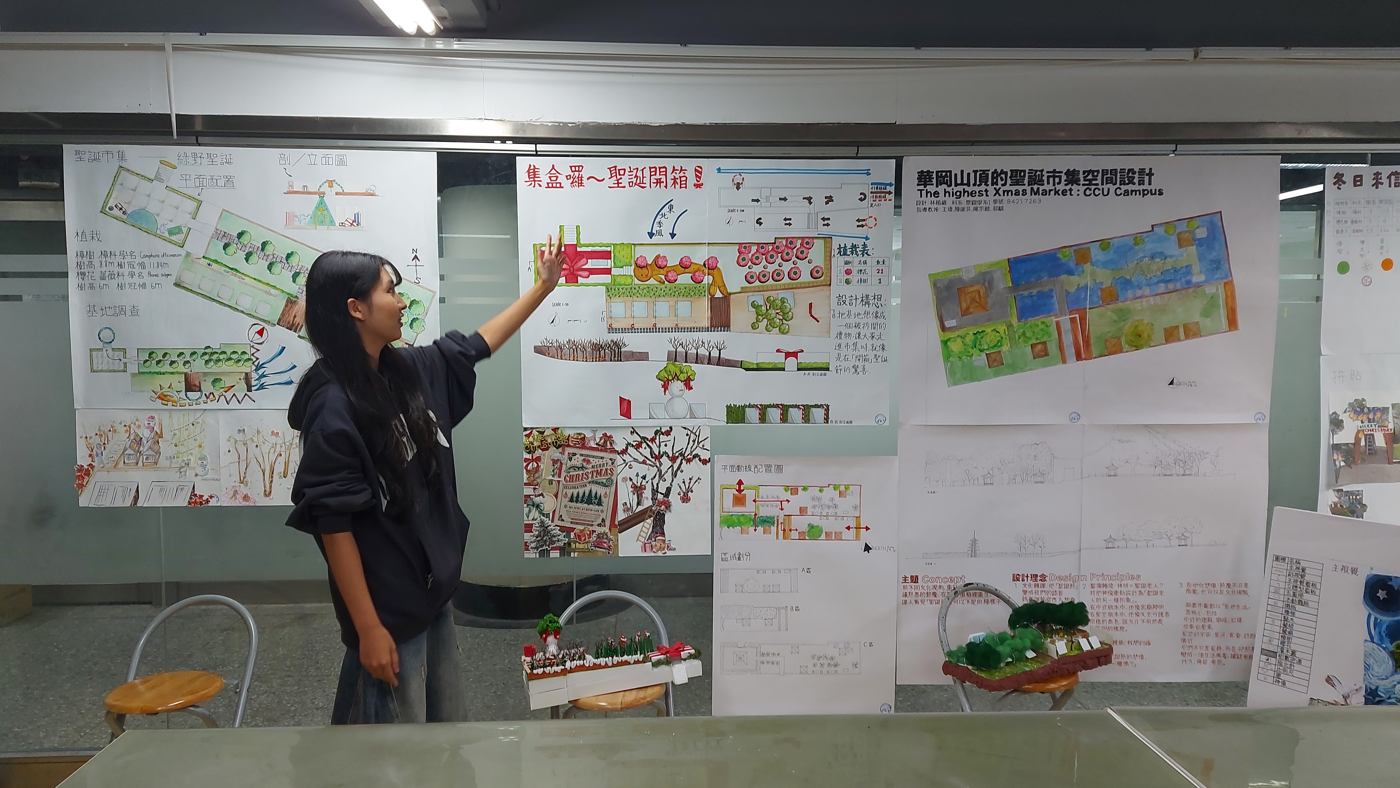 文大景觀今年從大一就開始實踐嘗試錯誤」trial and error,做中學」learning by doing 的設計教學理念,本年度計畫命名為最高的AI聖誕夢工場,配合校園聖誕樹點燈系列活動,結合建築與景觀對於環境尺度與材質的不同專業,原本兩系合作的規畫為景觀系學生進行空間規畫配置與設計,建築系學生進行面積 2x2m 木構造的設計,最後要一起進行1:1的施作,後因計畫趕不上變化,我們發揮隨機應變的韌性,建築系大一仍然進行1:1木構造的建構,但景觀系大一第一階段進行市集空間規劃設計,後期因應基地換位置,調整改為1:1的裝置藝術設計,創造出專屬於陽明山朝氣的聖誕夢工場。